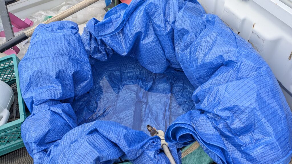 ・短期は、既存の雑草運搬バッグ(約550L)+ブルーシートで代替し、運搬潅水の効率を確保。