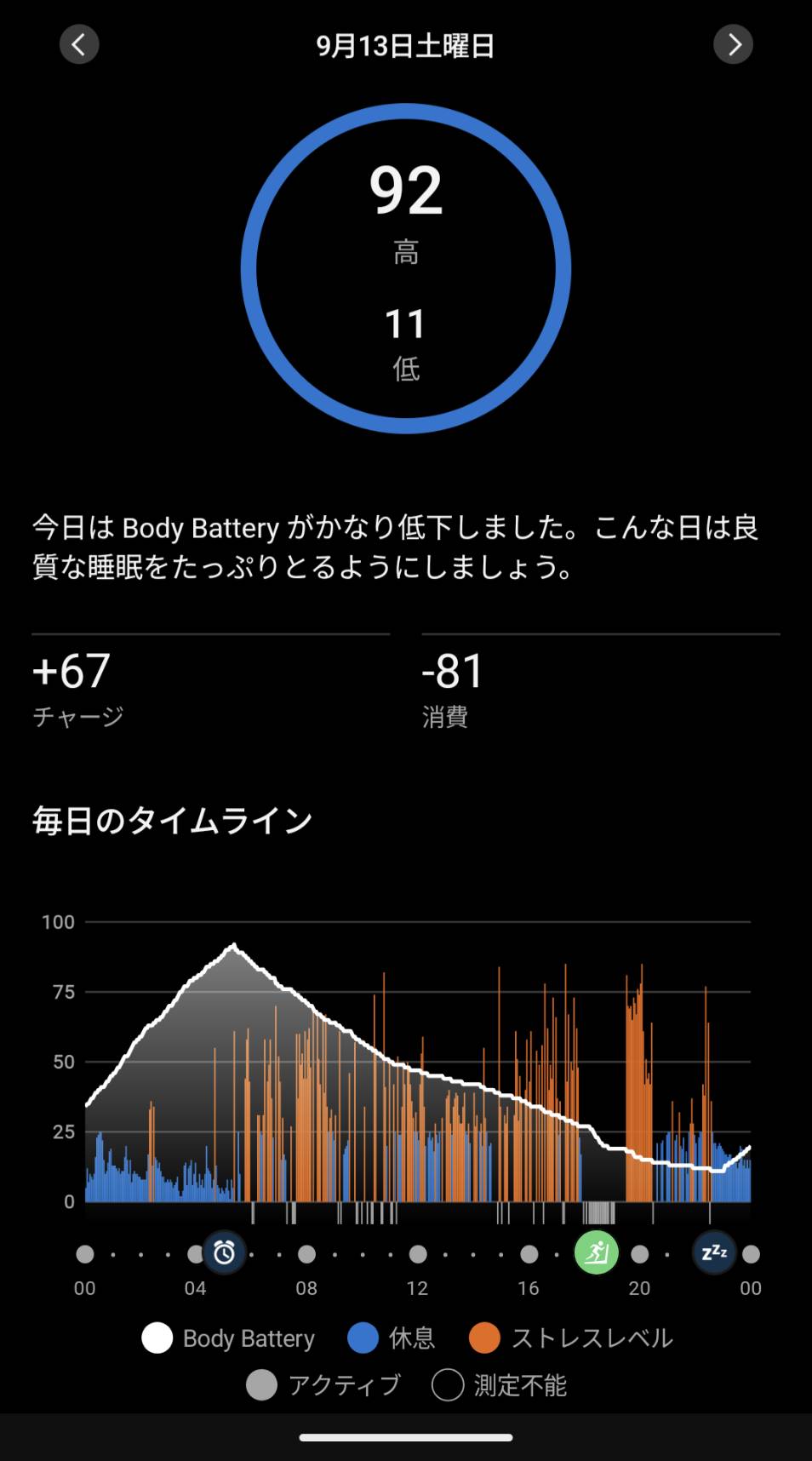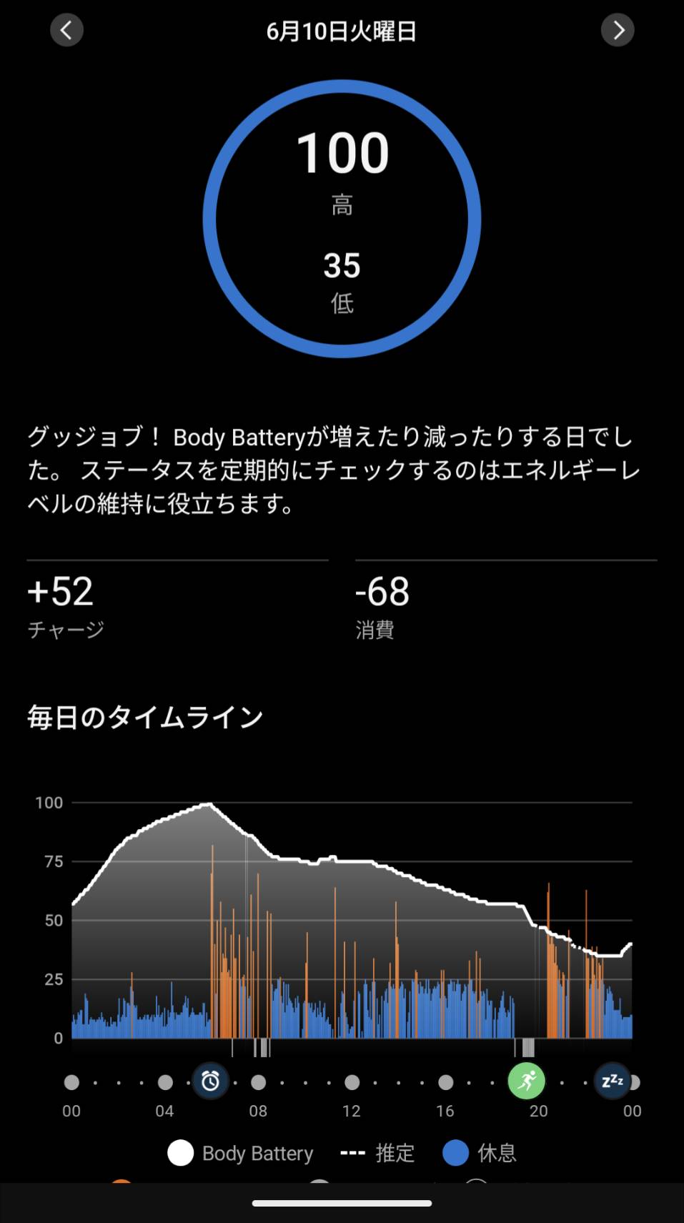 • スマートウォッチのBody Batteryという機能(体力満タンを100とした場合の残り体力や心身へのストレスレベルを可視化する機能)で自分の体調を常時モニタリングしている