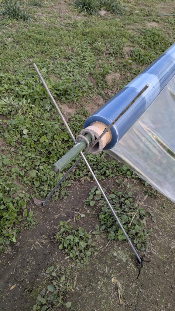 - ビニールロールに長い支柱を貫通させ、その支柱の両端をX字の支柱の交点部分に載せる