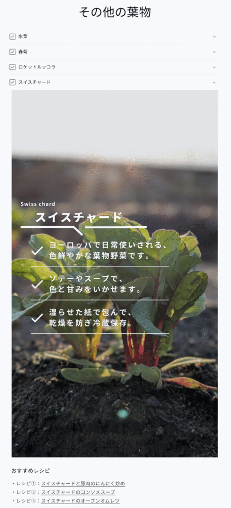 • ↓こんな感じ。プルダウンで該当の野菜を開くと、写真と簡単な説明、おすすめレシピ3選へのURLリンクがみられる。3時間くらいガーっと作業して、20品種弱くらい完成した。